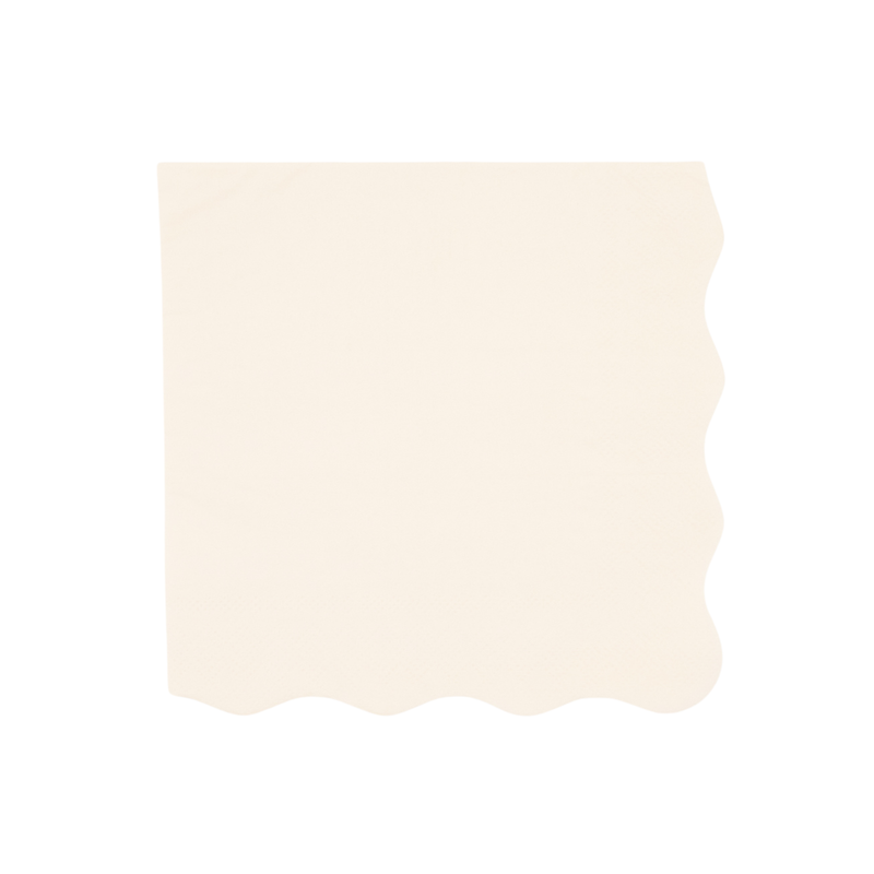 Full view of napkin with smiling gingerbread man, red bow, and scalloped red border.