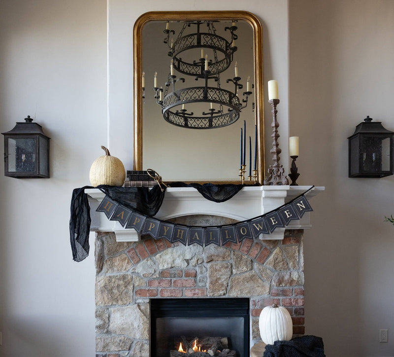 Studio shot of the complete banner: alternating black witch hats with bows and cream felt stars on a cord.